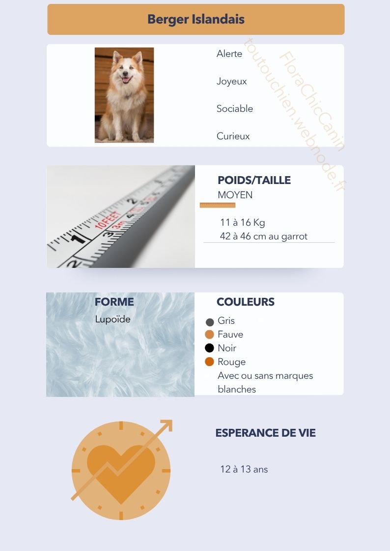 Le Berger Islandais est un chien de taille moyenne à petite, mesurant entre 42 et 46 cm au garrot pour un poids allant de 11 à 16 kg. Il présente une silhouette compacte, avec une ossature solide et une musculature bien développée, idéale pour le travail en terrain accidenté. Sa tête triangulaire, ses oreilles dressées et sa queue recourbée sur le dos rappellent clairement ses origines nordiques. Le poil est double, dense et imperméable, avec deux variantes : poil court ou poil long, les deux offrant une excellente protection contre le froid. Les couleurs de robe sont variées : fauve, noir, gris, rouge, souvent accompagnées de marques blanches. Son expression vive et amicale est l'un de ses traits les plus marquants.