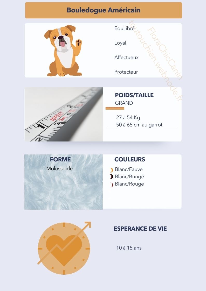 Le Bouledogue Américain est un chien moyen à grand, solide et musclé, avec une stature imposante. Il mesure généralement entre 50 et 65 cm au garrot et pèse entre 27 et 54 kg. Sa tête est large, avec un museau court, un stop marqué et des mâchoires puissantes. Ses yeux sont ronds, expressifs et bien espacés, tandis que ses oreilles peuvent être dressées ou semi-tombantes. Le poil est court, lisse et brillant, facile à entretenir. La robe peut présenter différentes couleurs, souvent un mélange de blanc avec des taches fauves, bringées ou rouges. Sa carrure robuste cache une grande agilité, lui permettant d'être très actif malgré son physique massif.