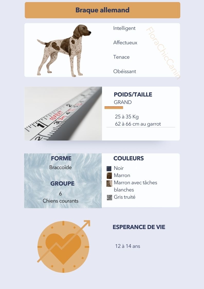 Le Braque allemand est un chien d'arrêt polyvalent, performant et élégant, qui séduit aussi bien les chasseurs que les familles dynamiques. Grâce à son flair exceptionnel, son tempérament stable et sa proximité avec l'humain, il s'adapte à de nombreuses situations, à condition de lui offrir une vie active et stimulante. Que ce soit sur le terrain ou à la maison, ce chien de chasse complet est un partenaire loyal, endurant et affectueux, idéal pour les passionnés de nature.